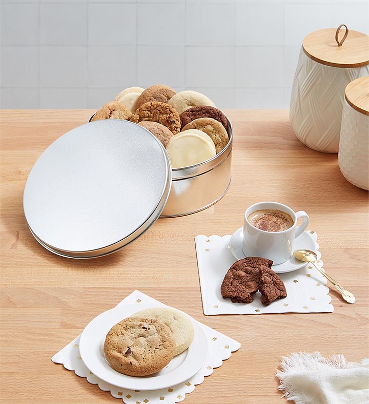 Send a delicious assortment of twelve gourmet cookies including our FAMOUS buttercream frosted cut-outs, chocolate chip, oatmeal raisin, chocolate chocolate chip, snickerdoodle and old-fashioned sugar cookies. Each individually wrapped cookie is carefully packed in a shiny gift tin. A gift they will love to receive. 12 cookies