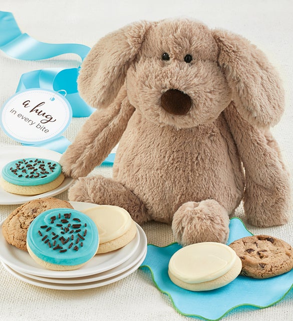 NEW! Surprise your special friends and family with a soft and huggable dog! Our keepsake plush arrives with an individually wrapped assortment including buttercream frosted cut-outs and classic chocolate chip cookies. A gift sure to brighten their day! Stands 12” tall. 6 cookies.