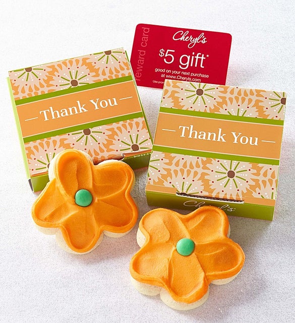 Sometimes the best way to say thank you is with a sweet buttercream frosted cookie tucked inside a cheerful gift box. Best of all, we’ve included a $5 Reward Card to use on a future online purchase at Cheryl’s. Gift includes 1 gift box, 1 cookie and 1 reward card. OU D.